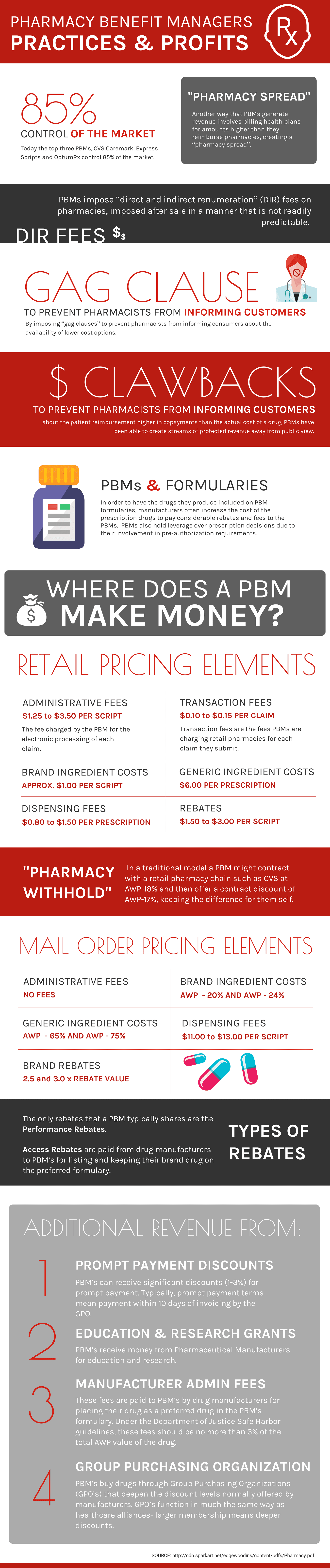 Many factors impact revenue generation for Pharmacy Benefit Managers. For example, PBMs have leverage over prescription decisions due to their involvement in pre-authorization requirements. Another way that PBMS generate revenue involves billing health plans for amounts higher than they reimburse pharmacies, creating a “pharmacy spread”. In addition, PBMs impose “direct and indirect renumeration” (DIR) fees on pharmacies, imposed after sale in a manner that in not readily predictable. To restrict the availability of lower cost options, PBMs use “gag clauses” with pharmacists to prevent them from informing consumers about lower cost options for prescription drugs. Another PBM strategy is the practice of “clawbacks”, patient reimbursement higher in copayments than the actual cost of a drug. This has enabled PBMs to be able to create streams of protected revenue away from public view.