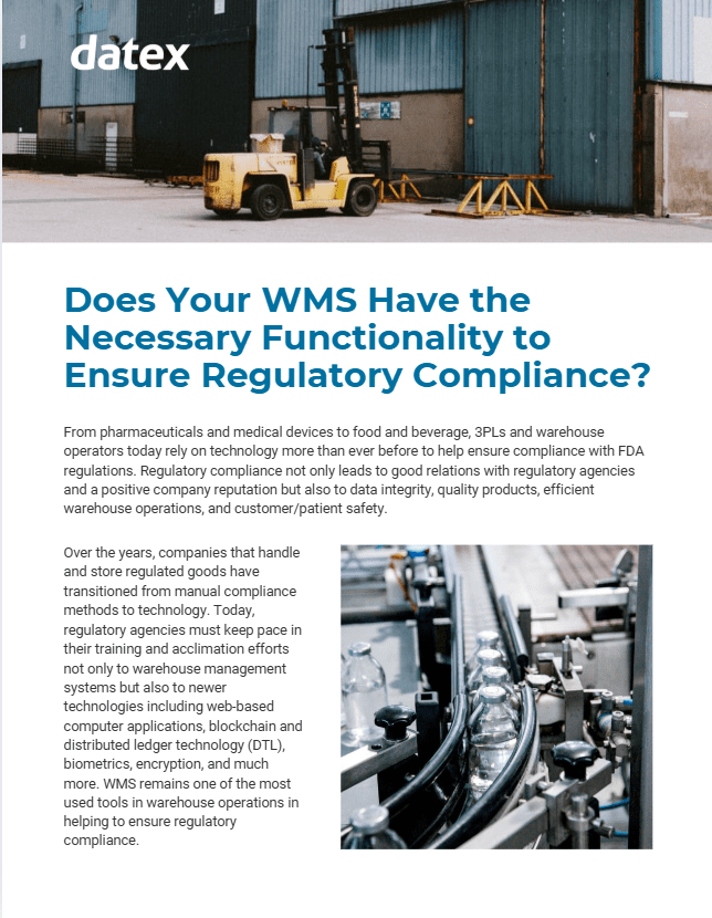 Across the supply chain, companies that handle regulated goods are often challenged to find easier ways to ensure compliance. Warehouse management systems (WMS) are one tool that is helpful in ensuring compliance. Modern warehouse management software provides warehouse operators with vital details about inventory. For companies that are actively looking for a new WMS, this white paper includes a list of capabilities that can help keep warehouse operations in compliance with regulations.