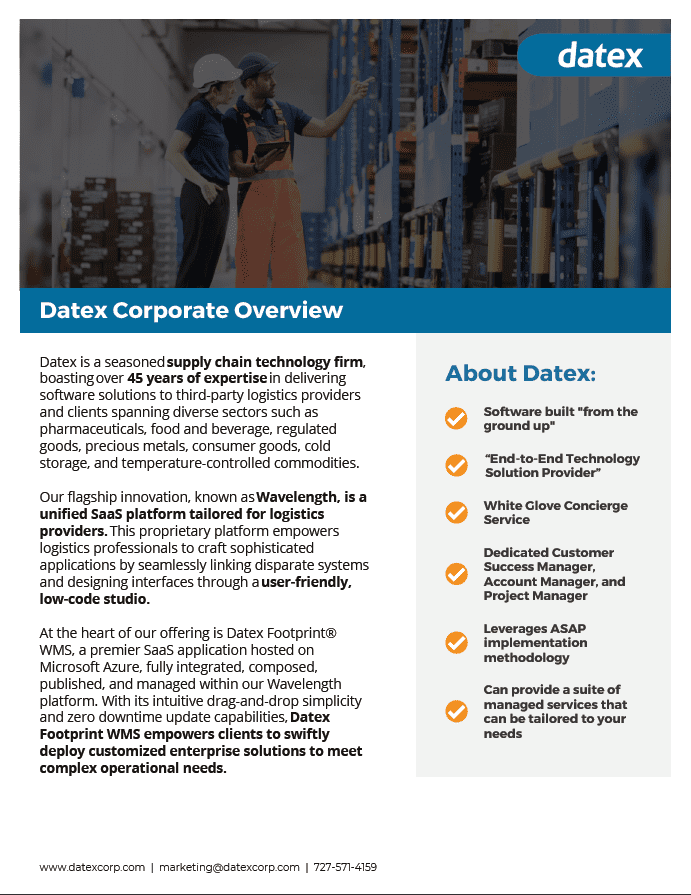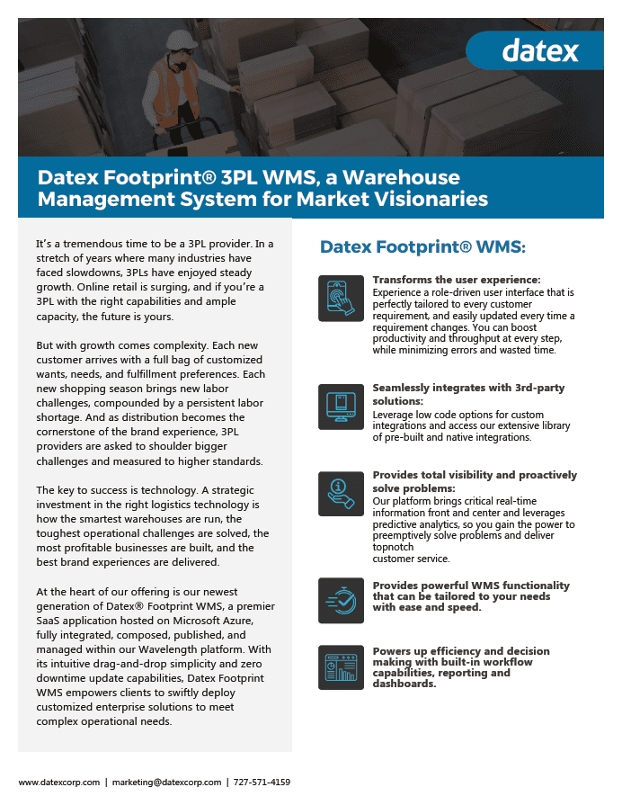 Datex Footprint® 3PL Warehouse Management Software (WMS) is a Microsoft based solution, developed for maximum flexibility, scalability, ease of use and information visibility.
