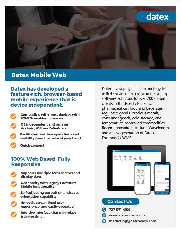 Datex Footprint® WMS is 100% web based that is fully responsive. Datex developed a feature-rich, browser-based mobile experience that is device independent.