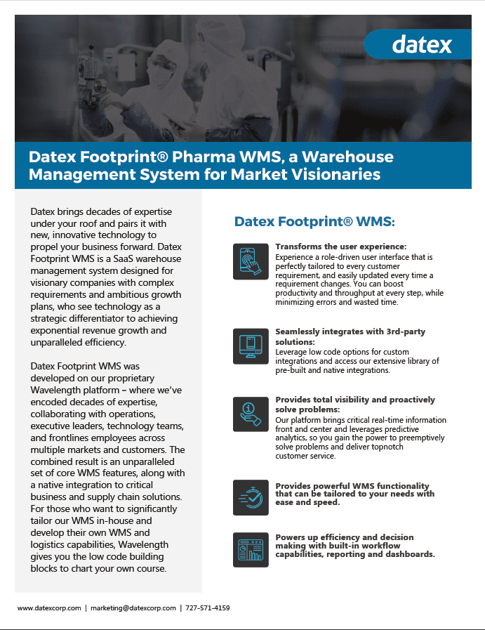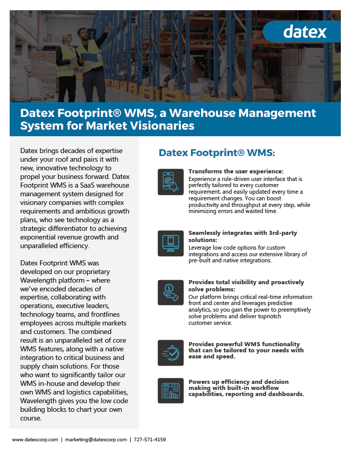 Datex Footprint® Warehouse Management Software (WMS) is a Microsoft based solution, developed for maximum flexibility, scalability, ease of use and information visibility.
