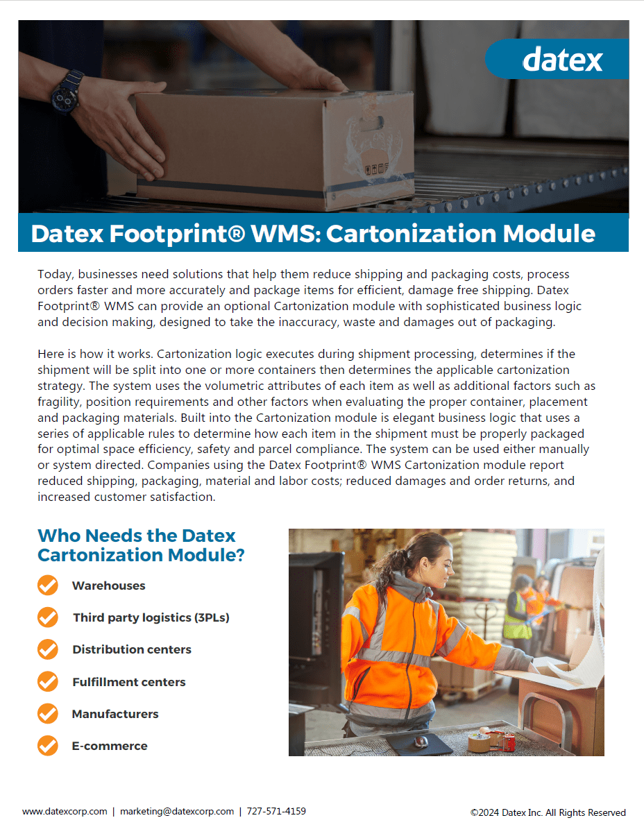 Datex Footprint® WMS can provide an optional Cartonization module with sophisticated business logic and decision making, designed to take the inaccuracy, waste and damages out of packaging.
