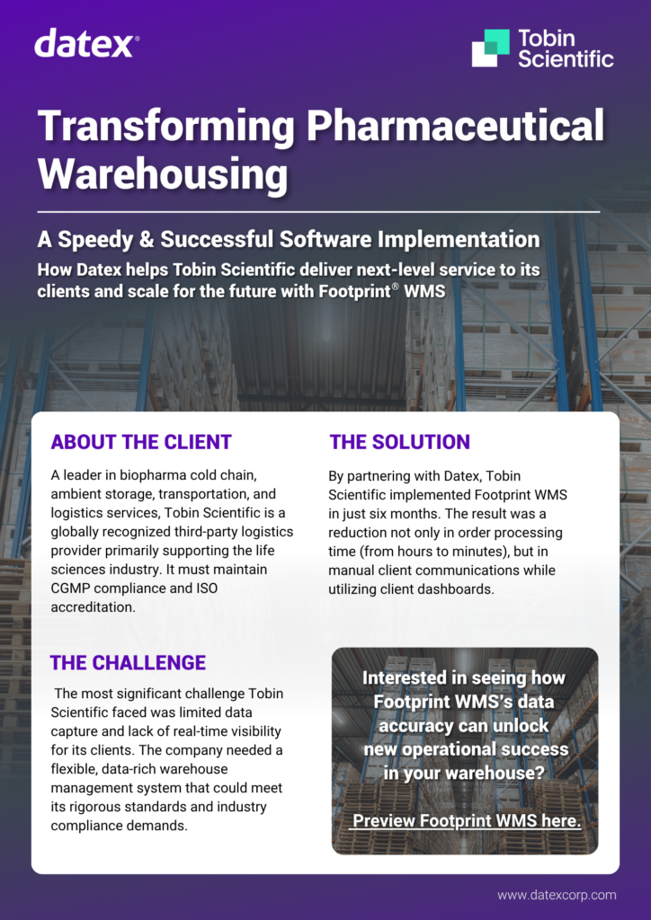 By partnering with Datex®, Tobin Scientific implemented Footprint® WMS in just six months. The result was a reduction not only in order processing time (from hours to minutes), but in manual client communications while utilizing client dashboards.